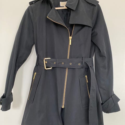 Hyväkuntoinen ja siisti Michael Kors trenssitakki, tummansininen. Koko S. Napeissa ja vyössä lukee Michael Kors. Taskuissa vetoketjut. Vähällä käytöllä ollut. Sisäpuolelta yksi lappu tullut leikattua pois. Näkyy kuvassa.