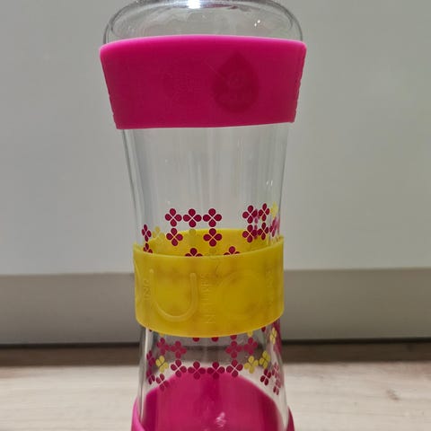 Equa lasinen vesipullo beigellä kuorella. Kunto oikein hyvä muuten, mutta korkissa tummentumaa (vika kuva).