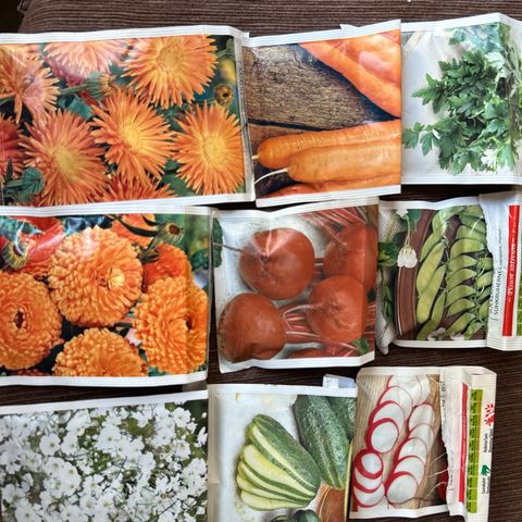 Erillaisia siemenpusseja. Paketeissa useita eri vihanneslajikkeita, kuten tomaatti, porkkana, kurkku, kesäkurpitsa, ruohosipuli, tilli, ruusukaali ja muita yleisiä puutarhakasveja. Pussit sisältävät siemenet avomaan tai kasvihuoneen viljelyyn. Pakkauksissa on merkitty kylvö- ja kasvatusohjeet. Punaisella merkitty kuinka monta pussia on myynnissä.