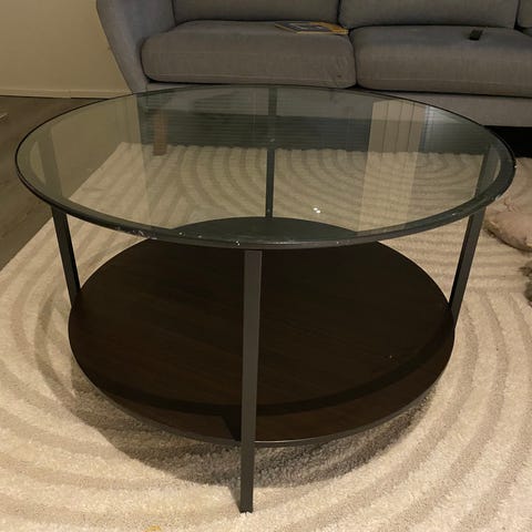 Valkonen lasinen sohvapöytä. Jotain jälkeä löyty lasikannesta ja alatasosta, vaikea saada kunnolla kuvattua. Ei kuitenkaan halkeamia tms. Nouto Niiralasta