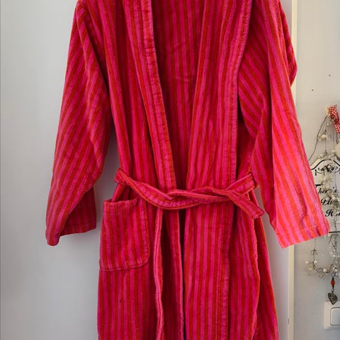 Kylpytakki on valmistettu 100 % puuvillasta ja siinä on kirjava, pinkin /punaisen sävyinen raitakuvio.