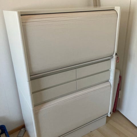 Annetaan 3 kpl valkoisia, rulo-ovellisia, lukittavia kaappeja. Olleet käytössä tv-tasona eli soveltuvat siihenkin, mutta sopivat monenlaiseen säilytykseen vaikka työhuoneessa tai toimistossa tms. Voidaan pinota päällekkäin. Siistit ja hyväkuntoiset, yhdessä ovessa pari pientä kolhua, kts. kuva.