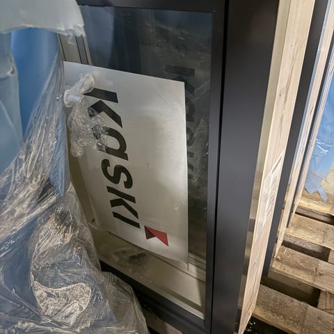 Kaskipuun ikkuna, ollut hetken käytössä, vaihtui kun oli väärä väri. Ulkopuoli musta alumiini, sisäpuoli valkonen.