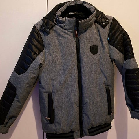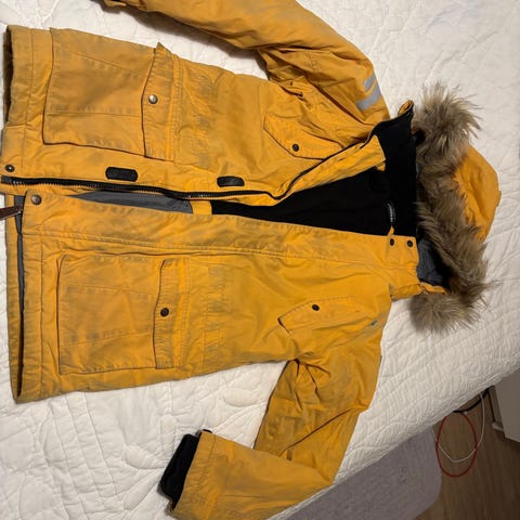 Lindberg talvitakki, koko 170. Valkoisissa kohdissa tummentumaa ja rintataskussa reikä, muuten hyvä takki seuraavalle.