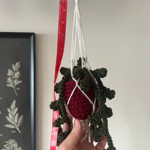 Käsityönä tehty roikkuva virkattu kasvi.