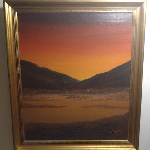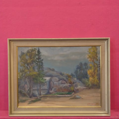 Matti Taskisen öljyvärimaalaus v.38. Signeerattu. Jokimaisema. 62 x 51 cm. Kehyksessä kulumaa.