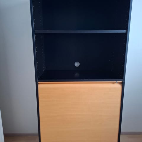 Kaksi samanlaista Martelan rulokaappia hyllyllä. Rulo-ovet toimivat moitteettomasti. Naarmuja yläpinnassa, en ole koettanut peittää/täyttää niitä.