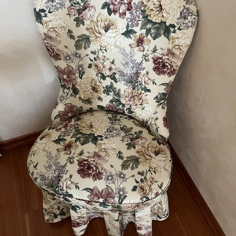 Isovanhempien aikainen kiikkustuoli,siisti ehjä päällisen voi vaihtaa ja yleensä joku koriste matto on ollut tuolin päällisenä