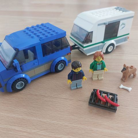 LEGO City leikkisetti, johon kuuluu sininen henkilöauto ja valkoinen asuntovaunu vihreällä raidalla. Setissä on kaksi minihahmoa sekä koirafiguuri. Autoon voi kiinnittää perävaununa toimivan asuntovaunun vetokoukulla. Sopii kaupunki- ja lomateemaisiin LEGO City -leikkeihin ja muiden LEGO City -sarjan settien kanssa yhdisteltäväksi.