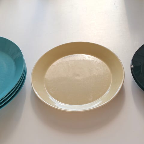 Neljä kappaletta Iittalan Teema syviä lautasia. Yhdessä reunasta lähtenyt pala. Kaikki kerralla.