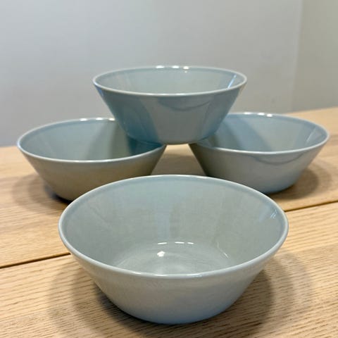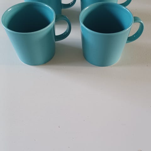 Viisi kappaletta Iittala Teema kulhoja, neljä turkoosia ja yksi tumma. Kolmessa kulhossa reunat ottaneet osumaa. Kaikki kerralla.