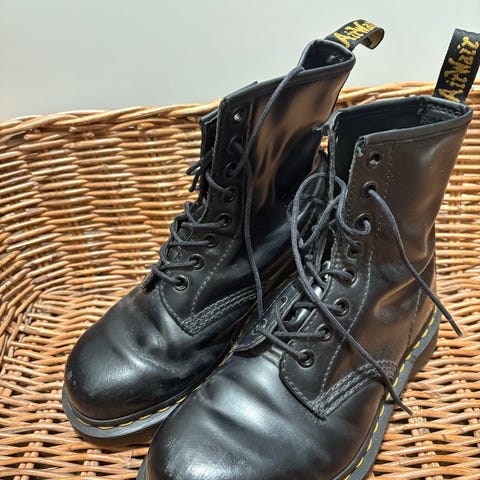 Turkoosinsiniset Dr. Martensin saappaat lumihiutale kuvioinnilla. Mitat kuvissa. Kunnoltaan hyvät, pientä käytönjälkeä.