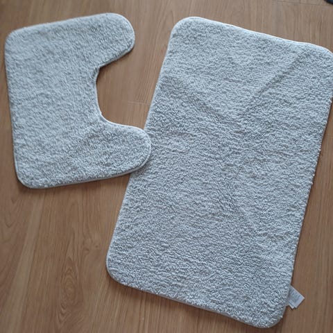 Wc kansi ostettu aikoinaan ja harmikseni jäi käyttämättä, siihen sopivasti itse virkattu matto (kaupan trikookudesta)