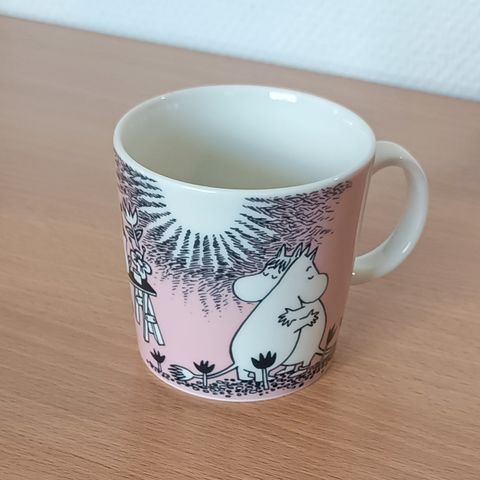 Arabia Rakkaus Muumi muki 3 dl vaaleanpunaisella kuvituksella. Muki on valmistettu keramiikasta ja siinä on Muumi-hahmoja eri puolilla mukia. Sopii kuumille ja kylmille juomille arki- ja kahvihetkiin. Pohjassa Arabia Finland -leima ja Muumi-kuva.