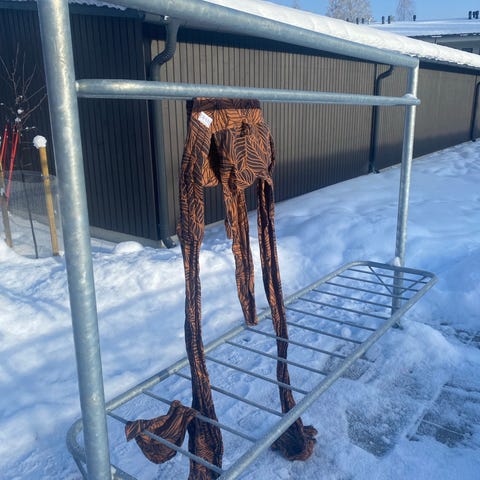 Materiaalitietoja ei tallessa, mutta muistelen tämän olevan luomupuuvillaa. Sormituntuman perusteella tosin mietin, olisiko mukana hitunen myös villaa.