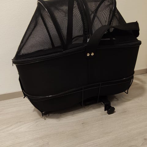 Kori kiinnitetään tavaratelineeseen ja siinä on suojakehikko, joka takaa turvallisen kyydin lemmikille. Korissa on pestävä pehmuste.