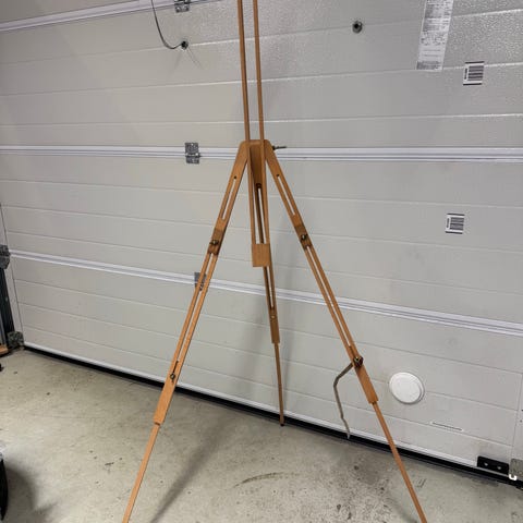 Puinen maalausteline kolmijalka. Teline on kokoontaitettava ja valmistettu vaaleasta puusta. Soveltuu esimerkiksi maalaus- ja piirustustöiden tukemiseen. Jalat ovat säädettävät ja telineen voi taittaa kasaan säilytystä tai kuljetusta varten.