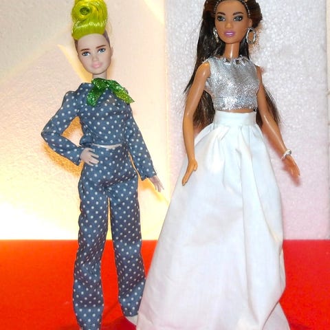 -Koko setti 9 e tai erikseen ostettuina 3 e/vaatekpl. Kohteeseen kuuluu mm. pitkiä mekkoja ja hilkka, jossa leuan alle solmittavat kangassuikaleet. Sopivat parhaiten nykyajan tavallisen kokoiselle Barbie-nukelle. Osa sopii myös edellisten vuosikymmenien Barbie-nukeille.