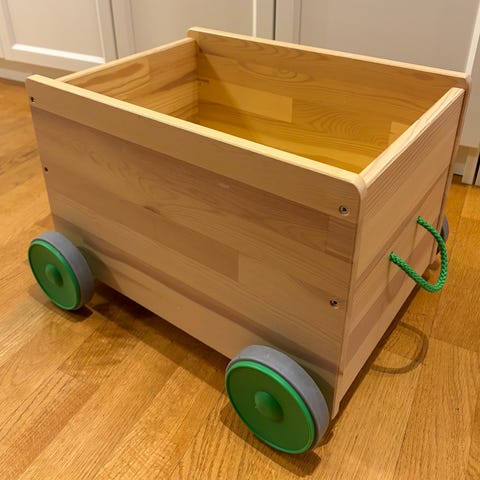 FLISAT Pyörällinen lelulaatikko vähän käytetty, tarroja kiinnitetty, pieniä lommoja. Pyörät toimivat hyvin. Massiivimäntyä. Vain nouto Pohjois Tapiolasta Espoosta