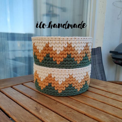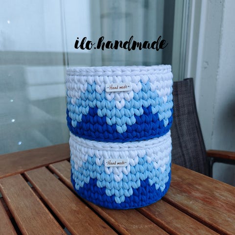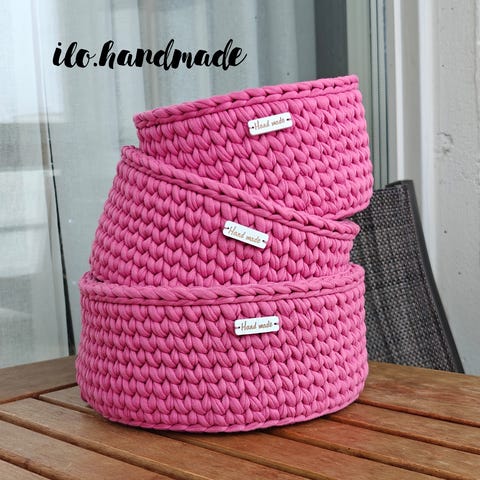 Sisustuskorit, käsintehty. Väri vaaleanpunainen. 100 % puuvillaa. Setti sisältää kolme koria. Koot: 14 × 8 cm, 17 × 8 cm, 19 × 8 cm.