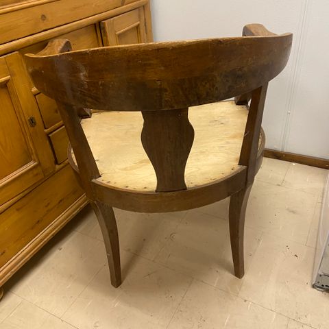 Puinen ruokapöydän tuoli, jossa on selkänojassa koristeellinen kaiverrus. Istuimessa on vaaleasävyinen, raidallinen kangasverhoilu. Tuoli soveltuu ruokailutilaan tai muuhun oleskelutilaan istuimeksi. Runko on puuta ja istuin pehmustettu mukavuutta varten.