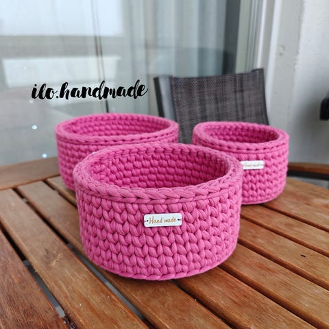 Sisustuskorit, käsintehty. Väri vaaleanpunainen. 100 % puuvillaa. Setti sisältää kolme koria. Koot: 17 × 10 cm, 19 × 10 cm, 21 × 10 cm.