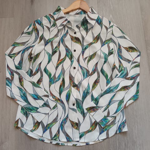 Valkomustapilkullinen kauluspaita, itse tehty. Puuvillakangas ja nepparikiinnitys. Pienet laskokset edessä ja halkiot hihansuussa ja helmassa. Koko reilu M, menee monenkokoiselle.