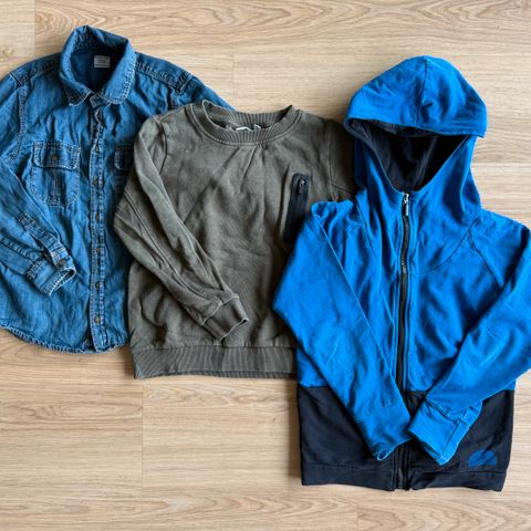 Kaikki kokoa 122/128. Keltainen lego collegepaita (H&M) eniten käytetty, siinä pesuhaitua. Stitch collegepaidalla (Name it) muutama käyttökerta, samoin Smurffi collegetakki (Name it) vetoketjulla erittäin siisti. Hajusteellinen pesuaine ja entinen koiratalous😊