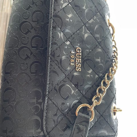 Guess olkalaukku naisille. Materiaalina kiiltävä musta tekonahka, jossa logokuviointi ja edessä metallinen Guess-logo. Laukussa on lyhyt olkahihna, jossa yhdistyy tekonahka ja metalliketju. Sisäpuolella on vuorikangas logokuviolla sekä vetoketjutasku pienten tavaroiden säilytykseen. Sopii esimerkiksi arjen peruslaukkuna tai iltalaukkuna, kun mukaan tarvitaan vain tärkeimmät tavarat.