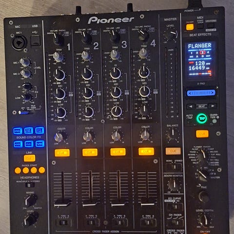 Pioneer DJM-750 DJ-mikseri. Nelikanavainen mikseri, jossa erilliset kanavakohtaiset gain-, EQ- ja suodatin säätimet. Laitteessa on sisäänrakennetut efektit, Sound Color FX -toiminnot sekä erilliset säätimet master-, booth- ja kuulokeohjaukselle. Etupaneelissa on liukusäätimet kanaville ja crossfader, yläosassa LED-tasomittarit. Sopii DJ-käyttöön esimerkiksi klubeille, baareihin tai kotistudioon, kun tarvitaan usean äänilähteen hallintaa ja perus- sekä efektimiksausta yhdessä laitteessa.