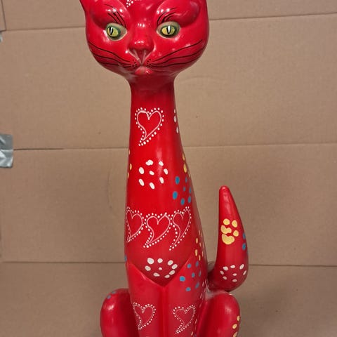 Erittäin hyväkuntoinen, nätti veistos. Taidekäsityötä, keramiikkaa. Ainoa vika on se että jalassa on pienen pieni pala liimattu. Värit: pehmeänvalkoinen kissa ja harmahtavan sininen mekko. Korkeus on 22 cm.