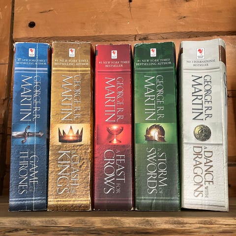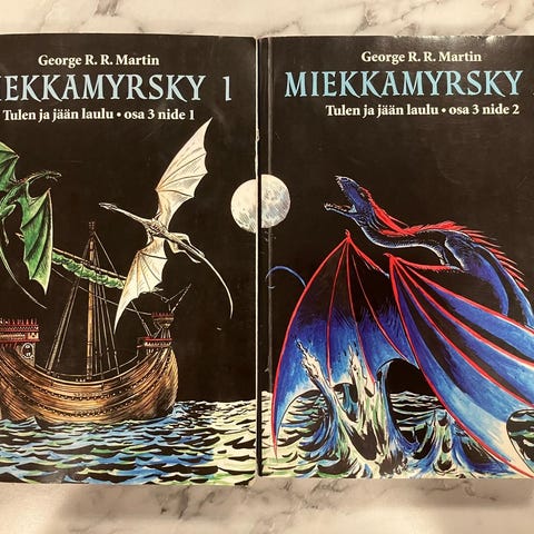 George R.R. Martinin fantasiaromaanit Valtaistuinpeli sekä Miekkamyrsky osat 1 ja 2. Kolmen kirjan kokonaisuus samaa kirjasarjaa, suomenkieliset pokkaripainokset. Kirjat erikseen 15€ kpl.