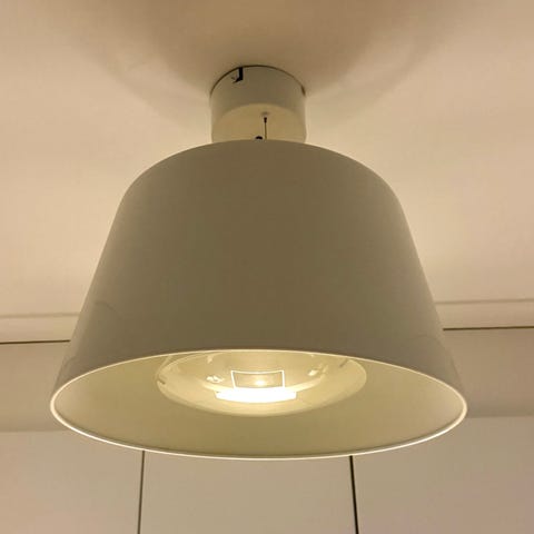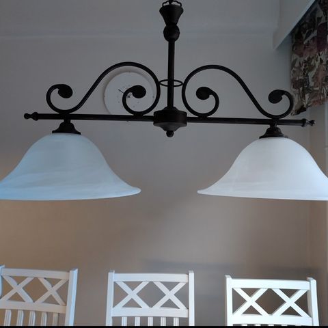 Kaksiosainen kattovalaisin, jossa tumma metallirunko. Mitat ovat noin mittoja: korkeus 47 cm, + johdon pituus, leveys 87 cm, syvyys 30 cm.