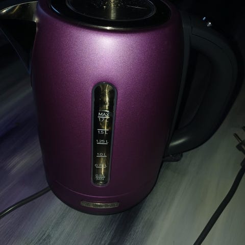 Käytetty mutta toimiva vedenkeitin jossa sininen valo. Voi keittää litran kiehumisvaralla. Kokonaistilavuus kuitenkin vajaa 1.5l