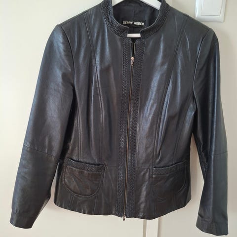 Gerry Weber naisten nahkatakki, koko 36. Väri musta. Materiaalina päällinen nahkaa, vuori tekokuitua (polyesteriä ja asetattia pesuohjeen mukaan). Malli on lyhyehkö ja vartalonmyötäinen, ilman kaulusta, edessä vetoketju ja koristetikkauksia. Sopii käytettäväksi arjessa ja siistimpänä takkina esimerkiksi housujen tai hameen kanssa.