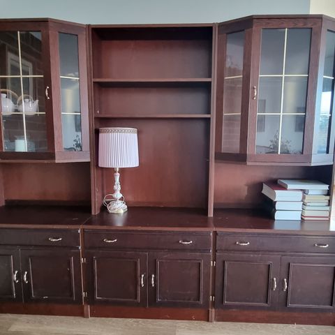 Kirjahyllyn saa kolmeen osaan. Baarikaappi. Vetimet metallia. Leveys 240 cm.