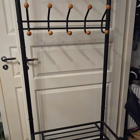 Musta metallinen Ikean naulakko ja kenkäteline. Korkeus 190cm ja leveys 79cm. Vain nouto.