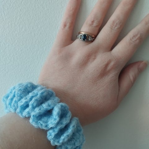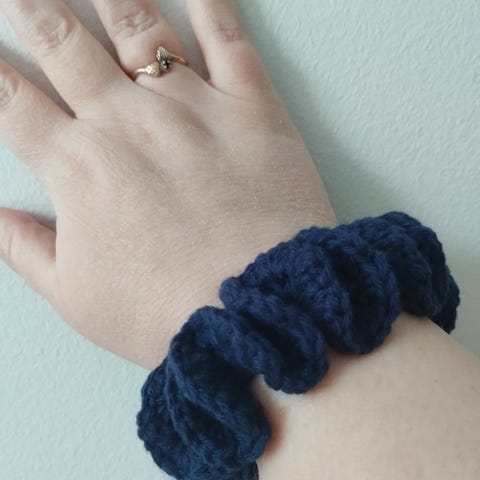 I designed this scrunchie, SJC Scrunchie 1, using a wool/polyamide blend yarn. You can purchase the scrunchie for the price listed. I also offer custom colors.
