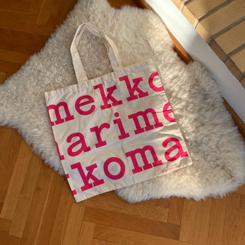 Marimekko kangaskassi. Uusi ja käyttämätön. Materiaalina kangas, jossa toistuva Marimekko-logo- ja tekstiprintti. Kassissa on kaksi kantokahvaa olalla tai kädessä kantamiseen. Soveltuu arjen ostoksille, tavaroiden kuljettamiseen ja yleiskäyttöiseksi kangaskassiksi.