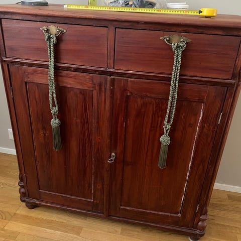 Puinen, tukeva senkki, jossa kolme laatikkoa ja kaksi kaappia.