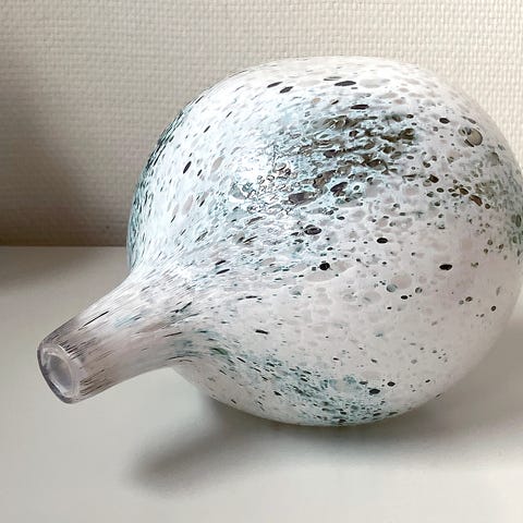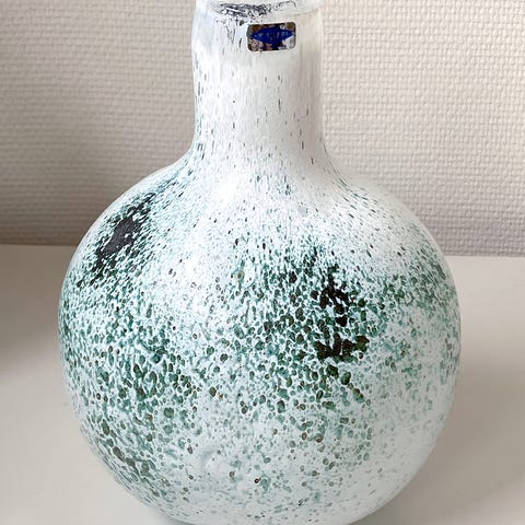 Myydään Toikan Tunturissa-sarjan vaaleasävyinen koristepullo. Käsinpuhallettua Nuutajärven lasia. Signeeraus ja merkintä ”Lääkefarmos -91”.