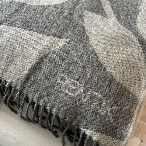 Kuvanmukainen Pentik torkkupeitto. Peitossa kaksi pientä vaaleaa jälkeä( näkyvät eka kuvassa vas . laidassa).