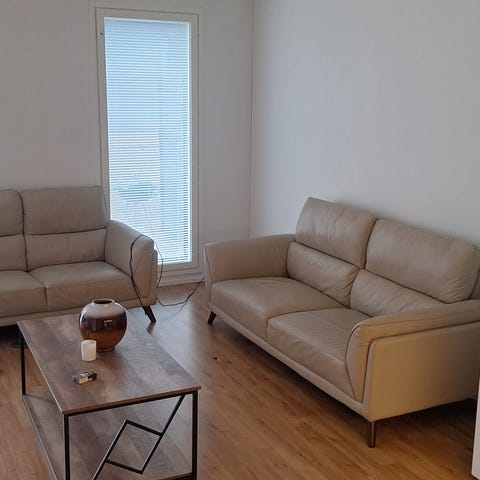 Sohva ryhmä on hyväkuntoinen. Runko on tukeva. Savuttomasta asunnosta ( ei tupakoitu sisällä). Verhoilu on nahka. Mitat Leveys 195cm syvyys 90cm, 2 kpl yhden istuttava Leveys 85cm syvyys 90cm. Väri ruskea