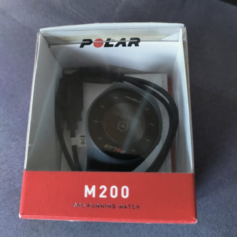Valkoinen polar urheilukello. Malli M200. Toimii edelleen. Piuha tulee mukaan.