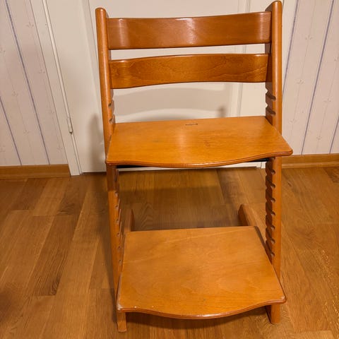 Stokke Tripp Trapp syöttötuoli valkoista puuta. Tuolissa on säädettävä istuin- ja jalkataso, jotka voidaan asettaa eri korkeuksille lapsen koon mukaan. Rakenne on tukeva ja suunniteltu lapsen ruokailu- ja oleskelutuoliksi. Soveltuu käytettäväksi ruokapöydän ääressä. Kuvissa näkyy käytön jälkiä rungossa ja maalipinnassa.