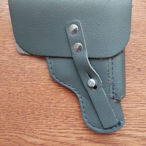 Läpällinen umpikotelo keskikokoiselle palveluspistoolille. Ei valmistajan leimauksia. Ompeleet ehjät ja nahka notkeaa. Lupavapaa asevaruste. Lähetyskulut Matkahuollolla 6,80€