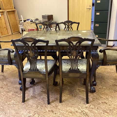 Kunto on ihan siisti, jotain naarmuja on havaittavissa pöydässä, myös tuolien selkänojat kiikkuvat, ne on varmasti korjattavissa.
