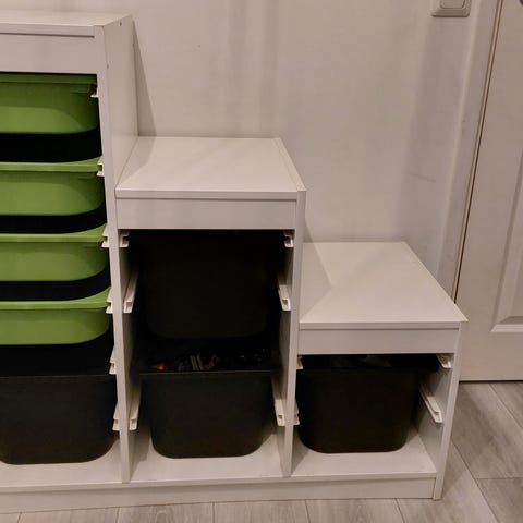 Myydään elämää nähnyt, mutta rungoltaan ehjä Ikean Trofast lokerikko jossa on mukana 3kpl vaaleanpunaisia ja 3kpl mustia muovilaatikoita.