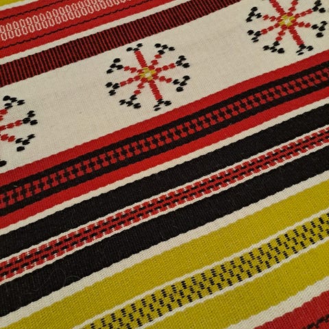Kangaspuilla kudottu kaunis raanu hillityin värein,uusi,ei ole koskaan ollut käytössä.