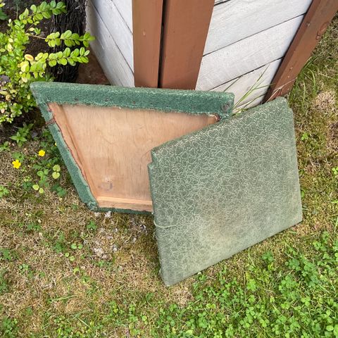 Täydellistä entisöintiä vaativa divaani. Puu osissa kulumaa ja jälkeä, esim. toisen puolen kuvioinnista pala pois.